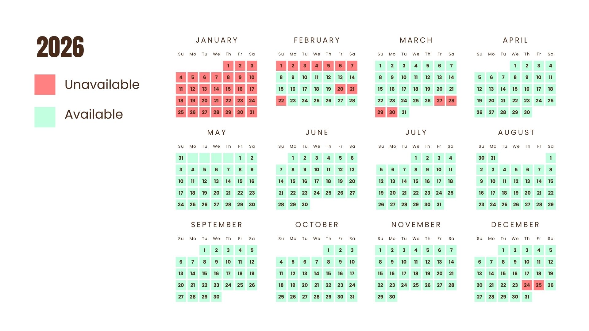 We offer direct bookings at a reduced rate. After checking the availability calendar, please fill in the booking form below and we’ll be in touch shortly to confirm everything.